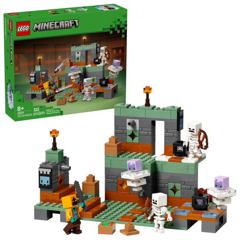 Die Prüfungskammern aus Minecraft bilden die Kulisse dieses Bauspielzeugs. Das Set beinhaltet 2 Skelette, 2 Breezes und eine Minifigur im Shadow Hoodie-Skin sowie 2 Spawner. Es gibt 2 Raketenkatapulte – jeweils 1 an beiden Wänden – und eine Rakete mit Federmechanismus und Abzug hinter der Rückwand. Der begehrte Schatz verbirgt sich in 3 Töpfen, die entweder einen Smaragd oder einen Diamanten enthalten. Für noch mehr Spielmöglichkeiten ist ein Raum auf der Rückseite des Modells mit Bett und Tisch eingerichtet. Digitalen Bauspaß bietet die LEGO Builder App, in der Kinder 3D-Modellansichten vergrößern und drehen und ihren Baufortschritt verfolgen können.