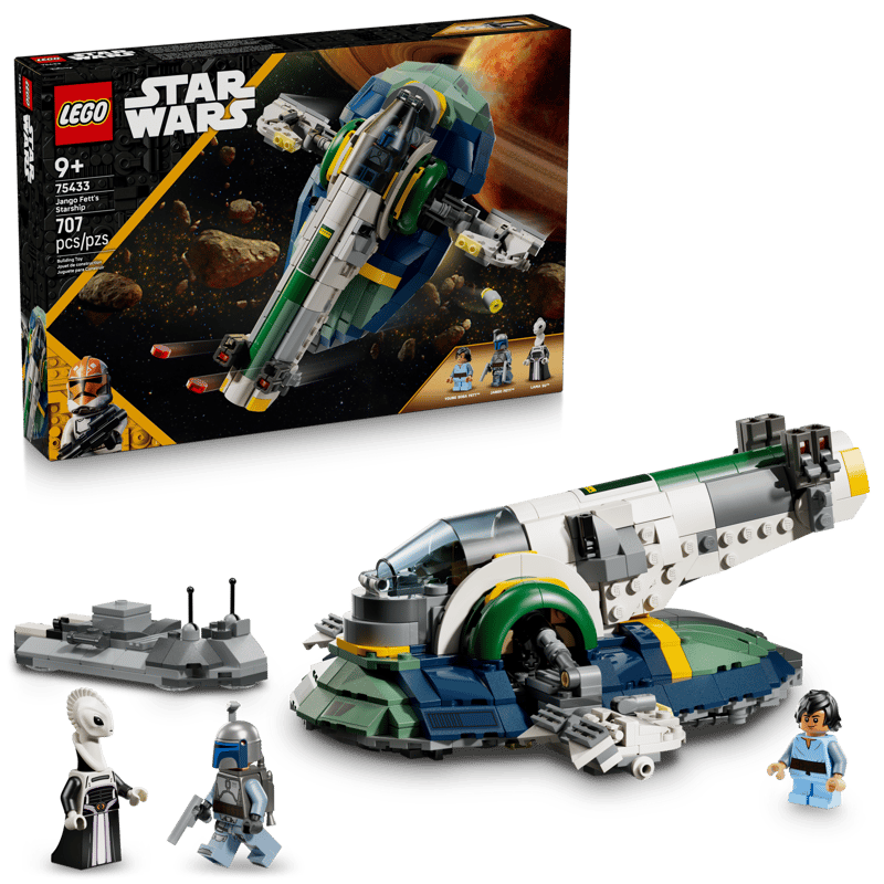 Das Set ist ein tolles Star Wars Geschenk für Kinder und beinhaltet 3 LEGO Minifiguren: Jango Fett mit 2 Blaster-Pistolen und Raketenrucksack, den jungen Boba Fett und Lama Su. Auf dem Servicewagen kannst du das Sternenschiff herumbugsieren. Er kann aber auch als Ständer dienen, um das Modell nach dem Spielen als Fantasy-Deko auszustellen.