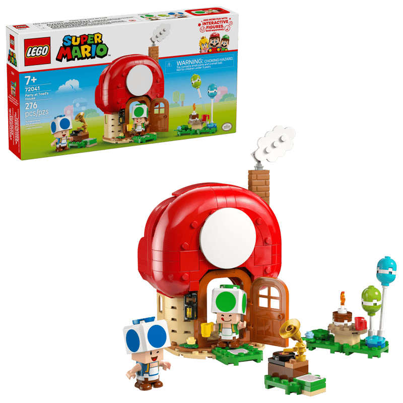 Dieses fantastische LEGO® Super Mario™ Spielset (72041) lässt Kinder eine Party im Toad-Haus darstellen. Das Bauset ist ein tolles kleines Geschenk für Jungen, Mädchen und alle Fans ab 7 Jahren. Ein detailreiches Toad-Haus mit Küche, Schlafzimmer (in dem ein Gemälde des Pilz-Palasts an der Wand hängt) und herausnehmbaren Möbeln lädt zum Spielen ein. Der blaue und der grüne Toad aus diesem Set können draußen am Picknicktisch Platz nehmen. Ein baubares Grammofon mit drehendem Plattenteller und Partyzubehör dürfen natürlich auch nicht fehlen. Man muss nur LEGO® Mario™, LEGO® Luigi™ oder LEGO® Peach™ aus einem der separat erhältlichen Sets 71439, 71440, 71441 oder 72043 zu diesem Bauspielzeug hinzufügen, um interaktiven Spielspaß zu erleben.Wenn eine dieser Figuren auf einen Funktionsstein steigt, spielt entweder Musik oder es läutet die Türklingel vorne am Haus. Bauanleitungen zu diesem LEGO Nintendo® Set findest du in der Box oder in der LEGO Super Mario App. Schau dir auch unbedingt di e anderen separat erhältlichen LEGO Super Mario Sets an. Dieses Set besteht aus 276 Teilen.